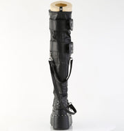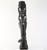 Additonal Description: 4 1/2" Tiered Platform. 4 1/2" (114mm) Tiered Pyramid Stud Trimmed Platform Stretch Over-The-Knee Boot Featuring Double Grommet Buckle Straps, Metal Chain W/ Spiked Ball Charm Center & Removable Strap Details, Full Inner Side Metal Zip Closure