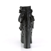 Additonal Description: 4 1/2" Heel, 2" Platform. 4 1/2" (114mm) Block Heel, 2" (51mm) Platform Ankle Boot Featuring Front & Back Satin Ribbon Lace-Up Details and Ruffled Ankle Strap w/ Hanging Chain Detail, Inner Side Zip Closure
