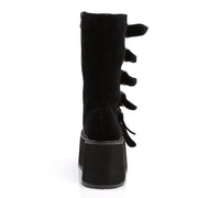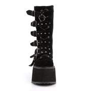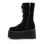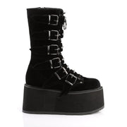 DAMNED 225 Black Velvet Platform Mid-Calf Boot with 6 Buckle Straps, Metal Side Zip