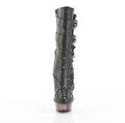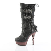 Additonal Description: 5 1/2" Finger Heel,1 1/2"PF. 5 1/2" (140mm) Finger Bone Heel, 1 1/2" (38mm) Platform Moto Mid-Calf Boot Featuring Corset Style Outer Lacing Detail, Double Skeleton Hand Buckle Straps, Spike Stud Details, Double Hanging Chains and Pewter Chrome Plated Bottom, Inner Side Zip Closure