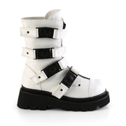 RENEGADE 55 White Vegan Leather Tiered Platform Strappy Calf High Boot, Center Front Zip