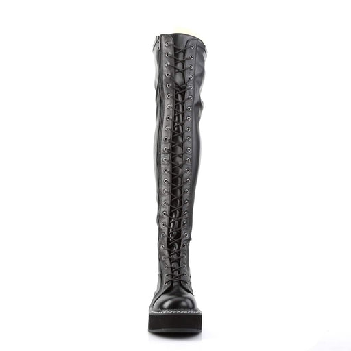 EMILY 375 Black Stretch Vegan Leather Platform Stretch Thigh-High Lace-Up Boot with Outer Metal ZipperDetails: 2 Inch Platform Brand: Demonia.