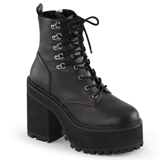 ASSAULT 100 Black Vegan Leather Platform D-Ring Lace-Up Ankle Boot, Side ZipDetails: 4 3/4 Inch Heel, 2 1/4 Inch Platform Brand: Demonia.