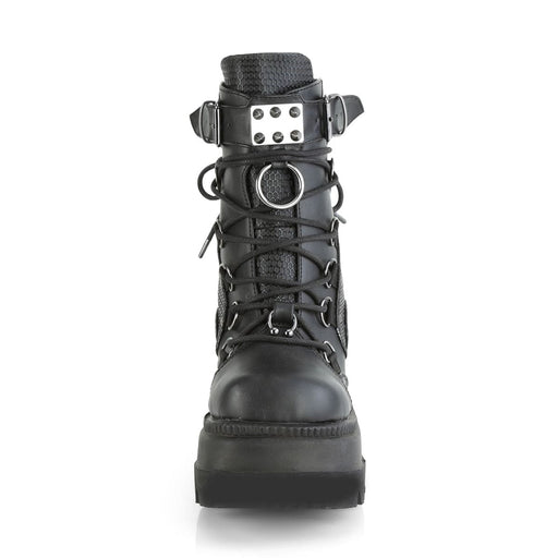 SHAKER 60 Black Vegan Leather Wedge Platform Lace-Up Ankle Boot, Back Metal ZipperDetails: 4 1/2 Inch Wedge Platform Brand: Demonia.