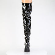 Additonal Description: 5 1/4" Stretch Platform. 5 1/4" (133mm) Heel, 1 1/4" (32mm) Platform Stretch Thigh Boot Featuring Side Mesh Panel w/ D-Ring & Hanging Chain Details and Cone Studded Bondage Strapping Up The Center w/ O-Rings, Full Inner Side Zip Closure