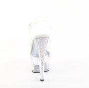 Additonal Description: 7" Heel, 2 3/4" PF. 7" (178mm) Heel, 2 3/4" (70mm) Platform Ankle Strap Sandal Featuring AB Rhinestones Encrusted on Platform Top Edge and Back of the Heel