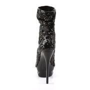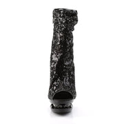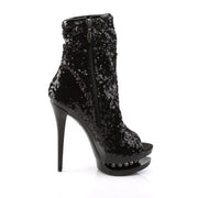 Additonal Description: 6" Heel, 1 1/2" Platform. 6" (15.2cm) Stiletto Heel, 1 1/2" (3.8cm) Platform Sequined Open Toe Ankle Boot Featuring Rhinestone Accents in Mid Platform Full Inner Side Zip Closure