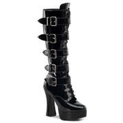Additonal Description: 5" Heel, 1 1/2" Platform. 5" (12.7cm) Stack Heel, 1 1/2" (3.8cm) Platform Knee Boot with 5 Buckle Detail, Full Inner Side Zip Closure