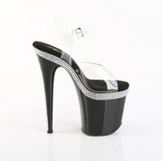 Additonal Description: 8" Heel, 4" PF. 8" (100mm) Heel, 4" (200mm) Platform Ankle Strap Sandal Featuring Multiple Rows of Rhinestones on the Platform Top Edge and Heel