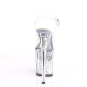 Additonal Description: 8" Heel, 4" Platform. 8" (200mm) Heel, 4" (100mm) Platform Ankle Strap Sandal w/ Holographic Glitter Filled Platform
