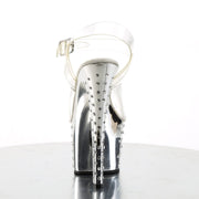 Additonal Description: 7" Heel, 2 3/4" Platform. 7" (17.8cm) Heel, 2 3/4" (7cm) Platform Ankle Strap Sandal Featuring Rhinestone Studded Chrome Bottom