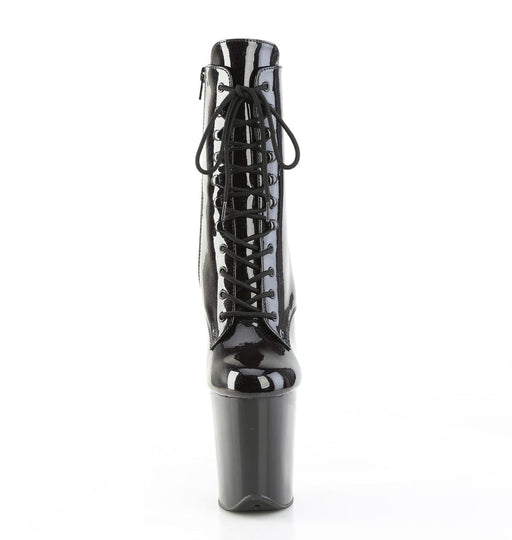 View full detailsFLAMINGO 800 14 Black Faux Leather/Black Matte Platform Lace-Up Front Bootie SandalDetails: 8 Inch Heel, 4 Inch Platform Brand: Pleaser.