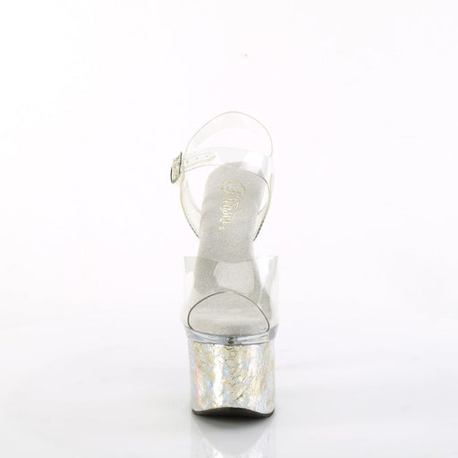 View full detailsESTEEM 708CK Clear/Clear-Silver Hologram Crackle Platform Ankle Strap SandalDetails: 7 Inch Heel, 3 Inch Platform Brand: Pleaser.
