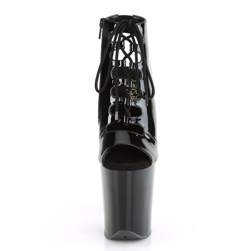 FLAMINGO 800 20 Black Patent/Black Platform Open Toe/Heel Front Lace Up Ankle BootieDetails: 8 Inch Heel, 4 Inch Platform Brand: Pleaser.