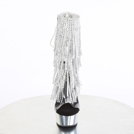 View full detailsDELIGHT 1017RSF Clear-Silver/Silver Chrome Platform Open Toe/Heel Lace-Up Fringe Ankle BootDetails: 6 Inch Heel, 1 3/4 Inch Platform Brand: Pleaser.