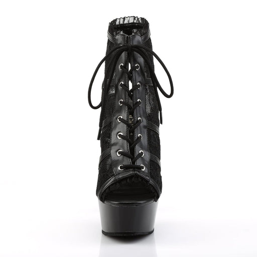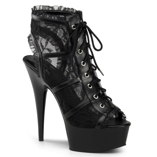 DELIGHT 696LC Black Mesh-Lace/Black Platform Lace Up Open Toe Open Back BootieDetails: 6 Inch Heel, 1 3/4 Inch Platform Brand: Pleaser.