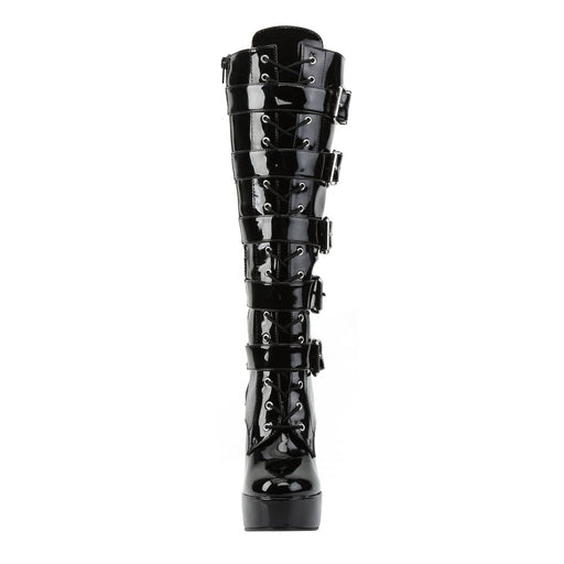 INFINITY 2020 Black Patent/Black Platform Front Lace-Up Knee BootDetails: 9 Inch Heel, 5 1/4 Inch Platform Brand: Pleaser.