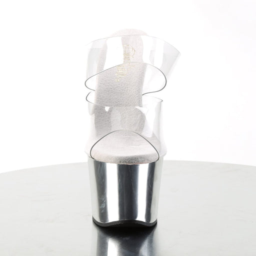 SKY 302 Clear/Silver Chrome Heel Two-Band Platform SlideDetails: 7 Inch Heel, 2 3/4 Inch Platform Brand: Pleaser.