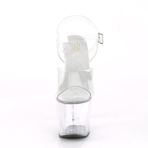 ADORE 708CG Clear/Silver Confetti Glitter Platform Ankle Strap Sandal with Glitter InsertsDetails: 7 Inch Heel, 2 3/4 Inch Platform Brand: Pleaser.