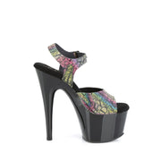 Additonal Description: 7" Heel, 2 3/4" Platform. 7" (178mm) Heel, 2 3/4" (70mm) Platform Ankle Strap Sandal Featuring Holographic Random Letters Print Upper