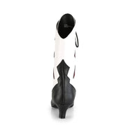 Additonal Description: 2" Kitten Heel. 2" (5.1cm) Kitten Heel Lace-Up Front Mid-Calf Boot Featuring Clown Shoe Design w/ Cotton Puff on Toe, Inner Side Zip Closure