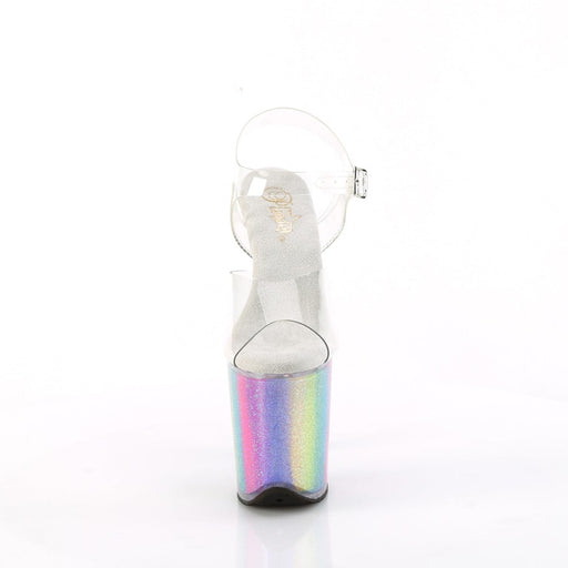 View full detailsFLAMINGO 808RG 01 Clear/Rainbow Glitter Platform Ankle Strap SandalDetails: 8 Inch Heel, 4 Inch Platform Brand: Pleaser.