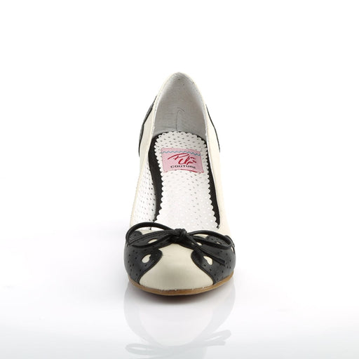 WIGGLE 17 Black-Cream Faux Leather Cuben Heel Pump with Bow at ToeDetails: 2 1/2 Inch Cuben HeelBrand: Pin Up Couture.