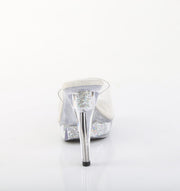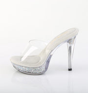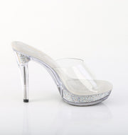 Additonal Description: 5" Heel, 1" Platform. 5" (127mm) Heel, 1" (25mm) Platfom Slide Featuring Multi Shape Silver AB Rhinestones Inserted in the Platform and Heel