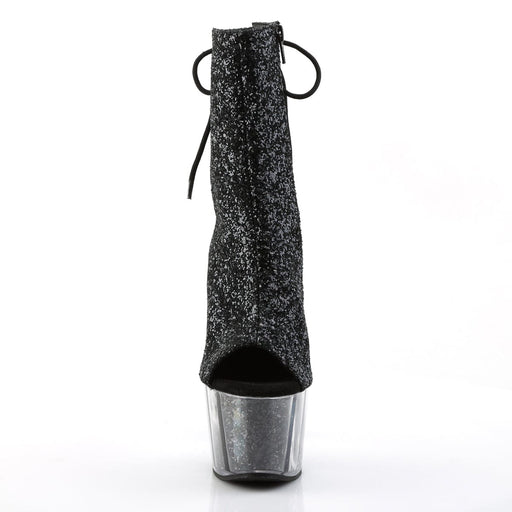 ADORE 1018GT Black Glitter/Smoke Tinted Tinted Platform Open Toe Ankle Boot, Side ZipDetails: 7 Inch Heel, 2 3/4 Inch Tinted Platform Brand: Pleaser.