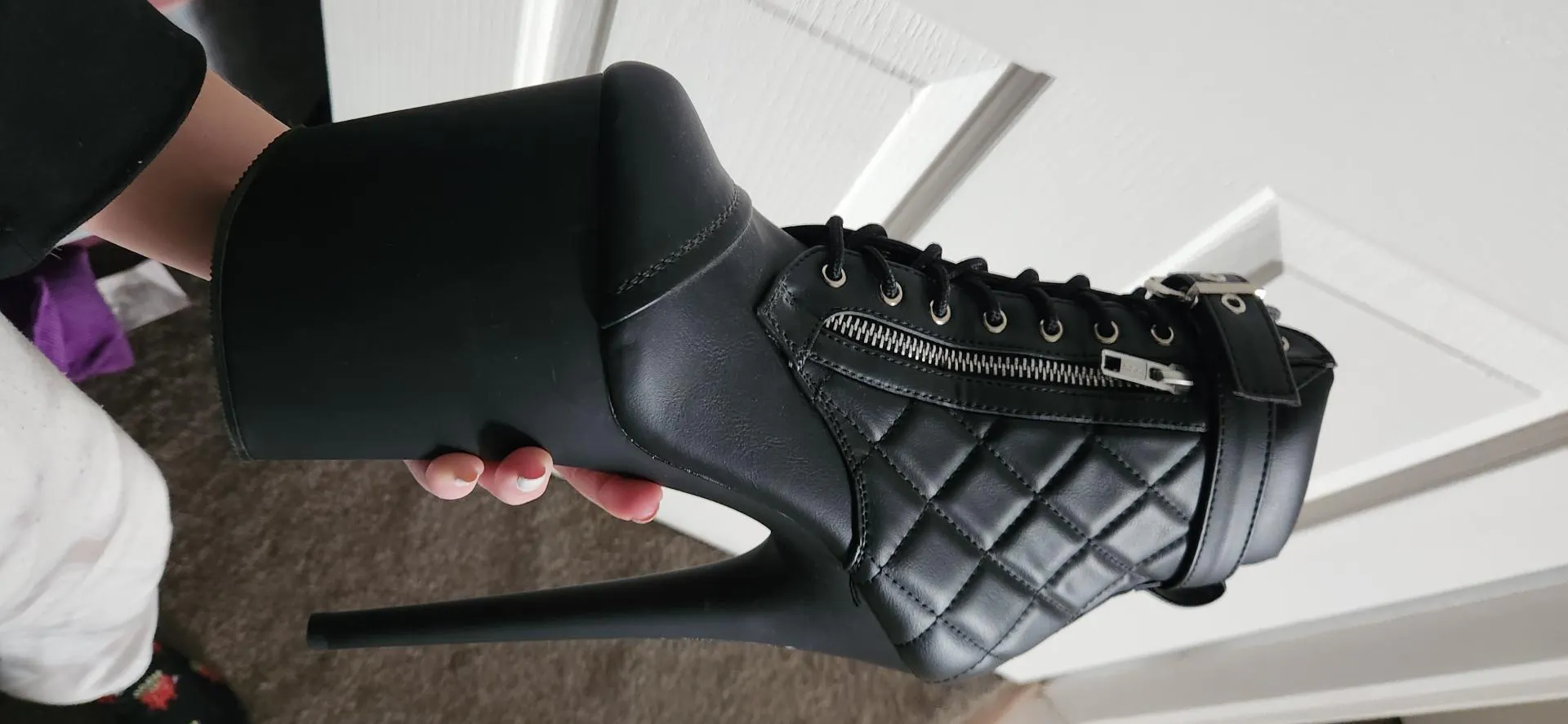 Additonal Description: 8" Heel, 4" Platform. 8" (200mm) Heel, 4" (100mm) Platform Lace-Up Front Ankle Bootie w/Buckle Ankle Strap Featuring Quilted Pattern Side Panels & Outer Side Metal Zip Pocket, Inner Side Zip Closure